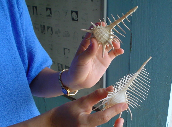陈老师先让我们了解「贝」和「螺」的差异。她说:「贝是两扇相合,螺是一体成形。」首先介绍的是「芋螺」--「芋螺的毒是神经毒,咬到会肿。而杀手芋螺的毒性是芋螺中的毒王,足以毒死人」。没想到披著美麗外衣的芋螺竟是海洋杀手。