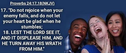 毫無疑問的,「我們不可因看見敵人遭殃而高興」,如果我們幸災樂禍,耶和華會不喜悅[5]。這個不可因惡人受罰而幸災樂禍的「禁令」,讓我們明白:神認為幸災樂禍「在道德上是令人厭惡的」[6]。